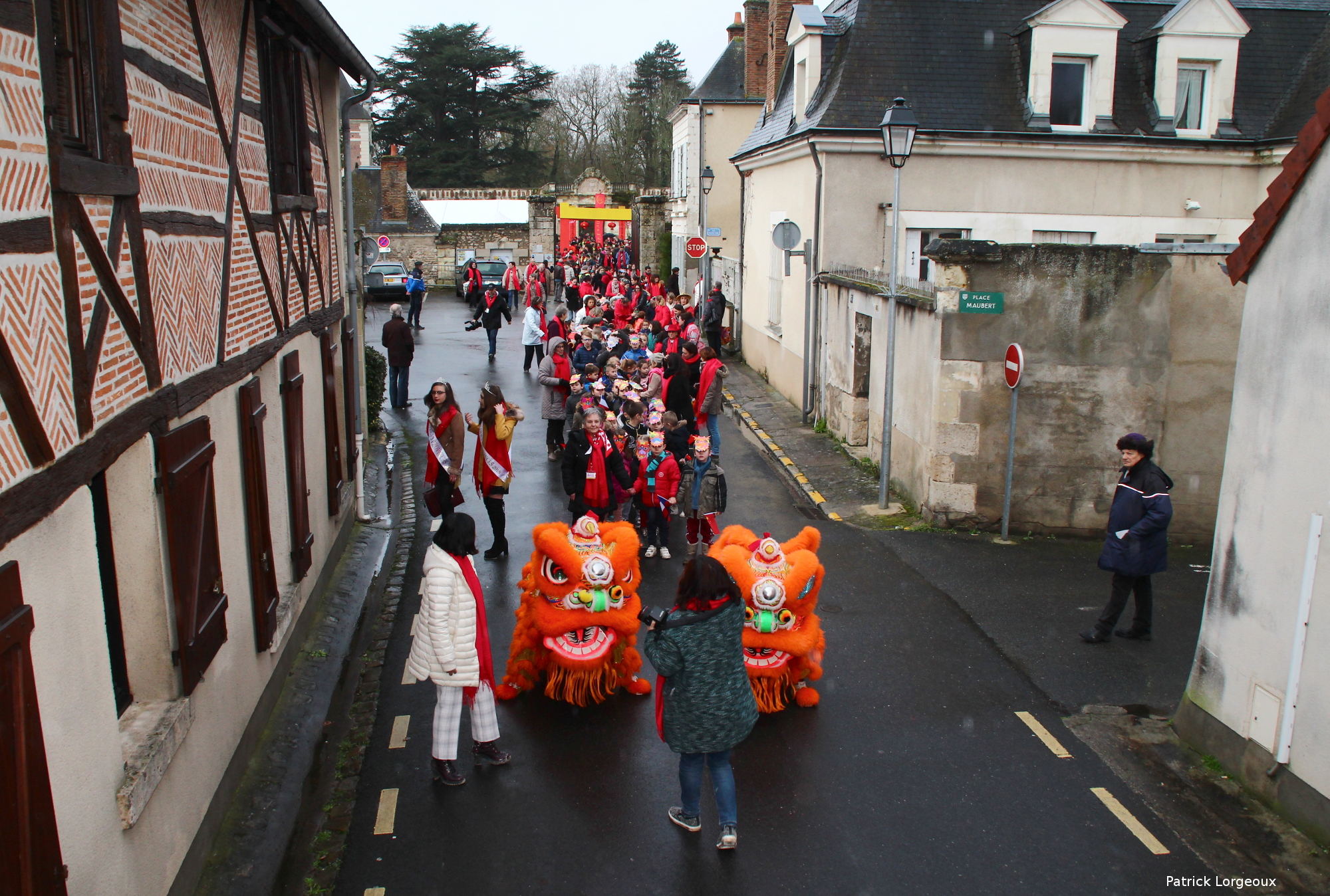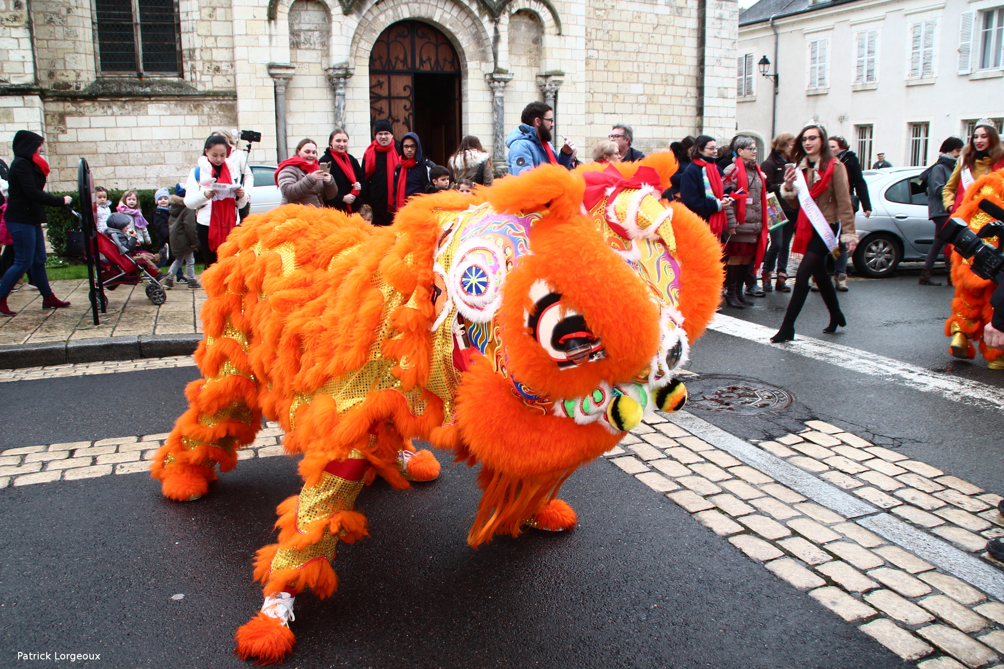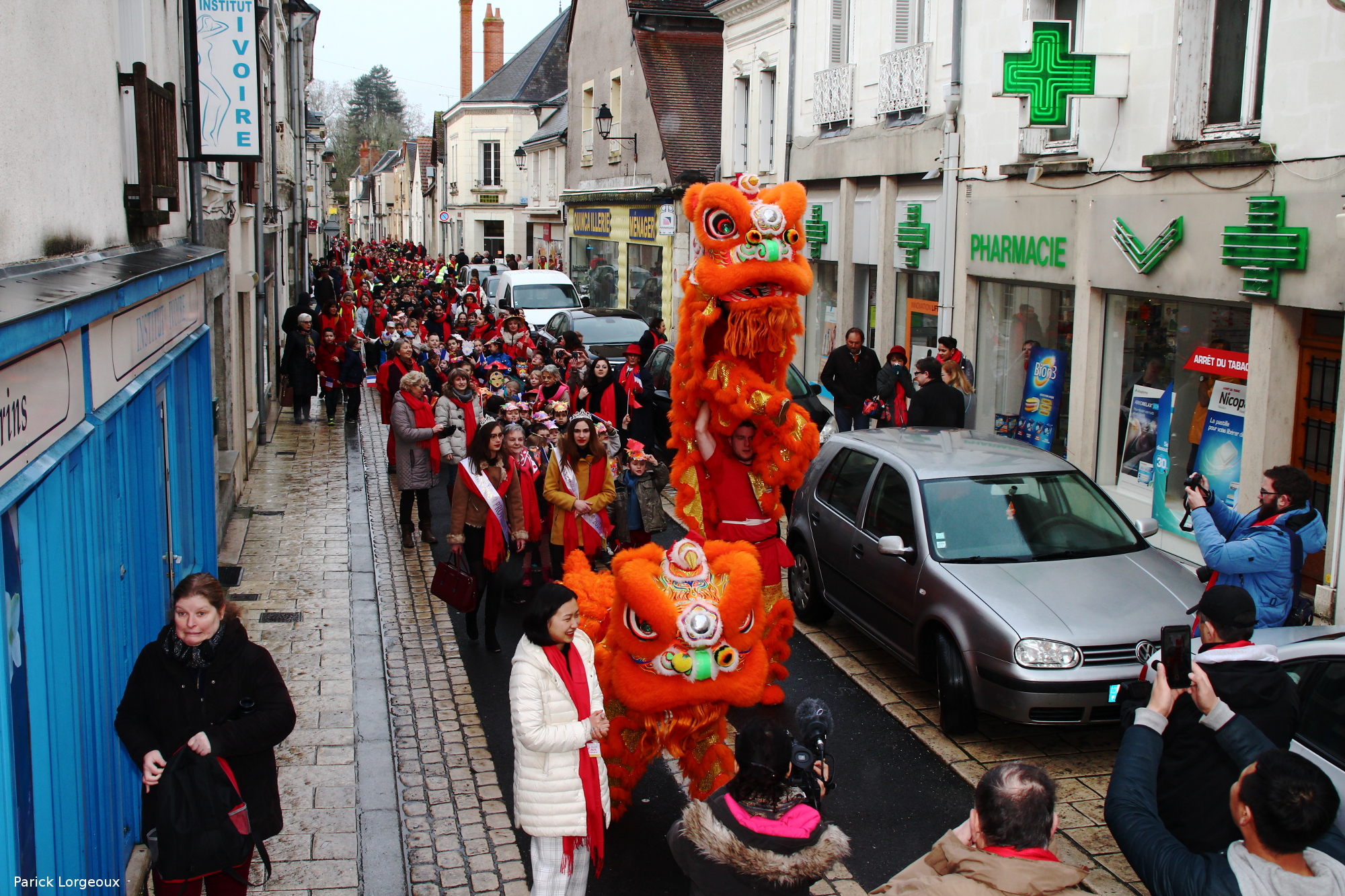 Après la danse des lions, le défilé s’est élancé dans la ville de Selles-sur-Cher. Images par les Compagnons de Philippe de Béthune.