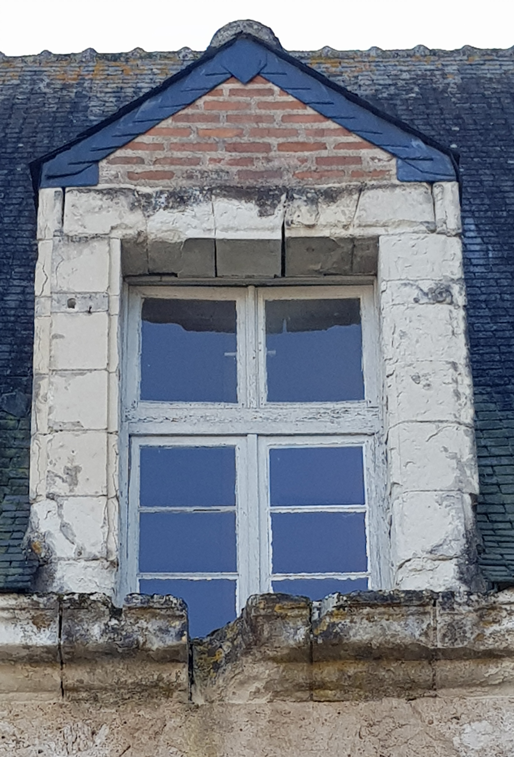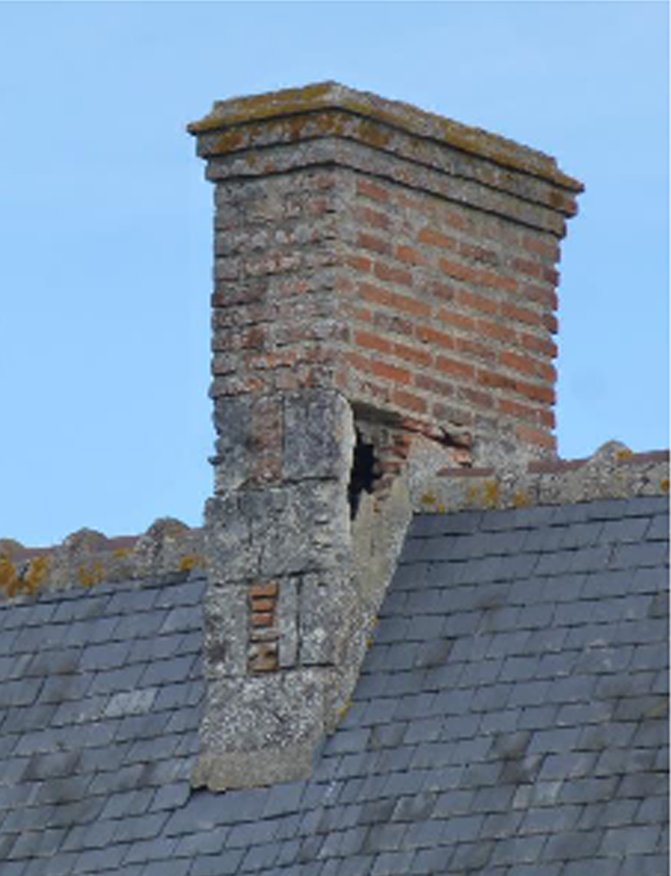 Par ailleurs, si la toiture en ardoises du XVIIe siècle est dans un assez bon état général, il n’en est pas de même des six cheminées, également du XVIIe siècle, dont cinq présentent des dégradations plus ou moins importantes. En effet, l’appareillage est constitué de briques et de tuffeau, pierre tendre qui se dégrade dans le temps. Certaines cheminées sont percées, elles risquent de s’effondrer à travers les toitures. Une remise en ordre de cette situation est nécessaire :