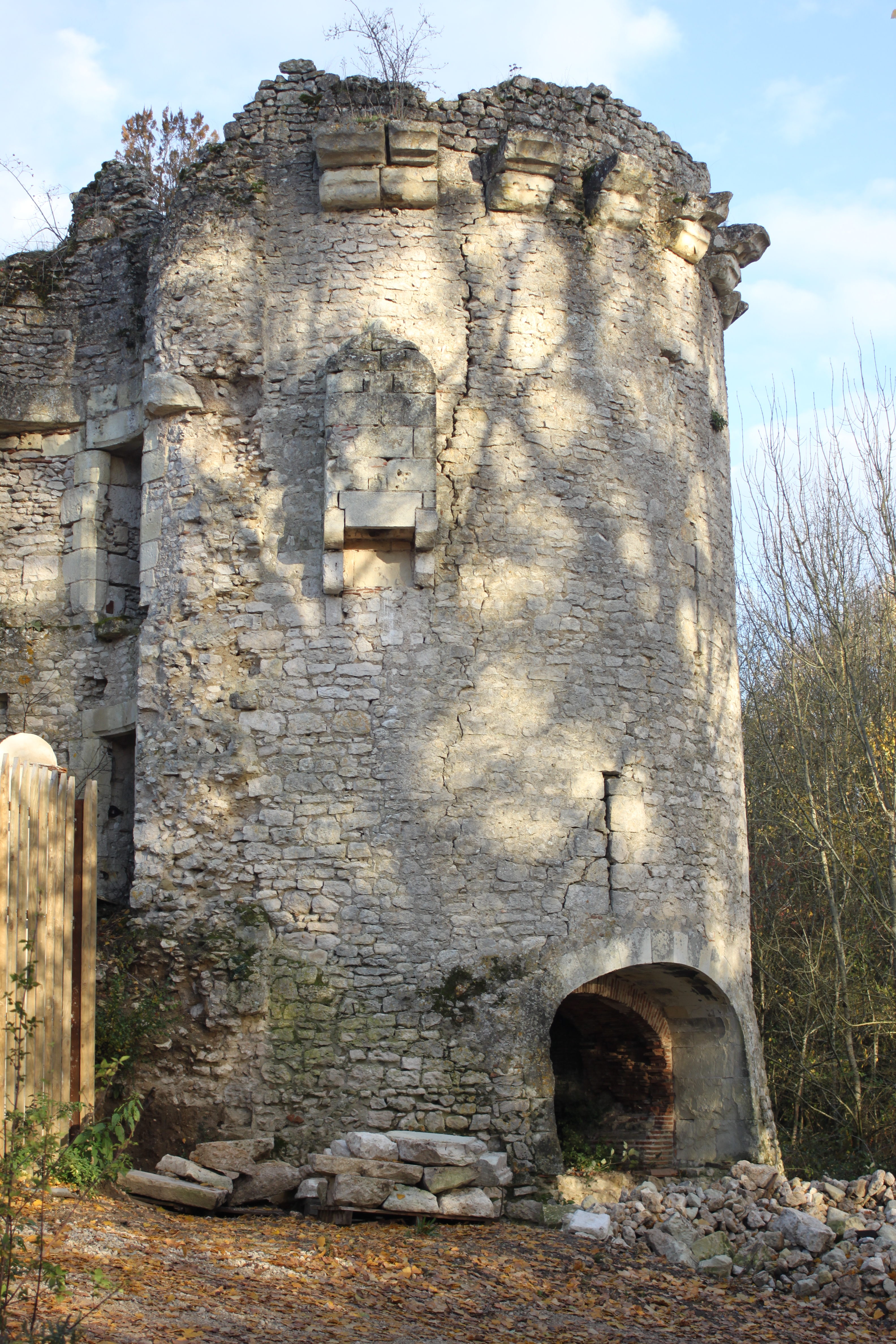 Cette tour est datée du XIIIe siècle. Elle défendait la pointe de l’enceinte vers le sud du site, à proximité du pont qui permettait l’accès à la cour médiévale. Cette tour a connu, semble-t-il, des modifications au cours des temps. Elle montre actuellement la présence de ce qui peut être interprété comme un four à briques dans sa partie basse, mais non daté. La partie supérieure est dégradée, devenue non protégée des intempéries, sa paroi vers l’ouest perd régulièrement ses maçonneries. L’accès à cette tour est maintenant abandonné, tandis que les pierres des maçonneries s’accumulent à sa base. Une remise en ordre de cette situation est nécessaire :