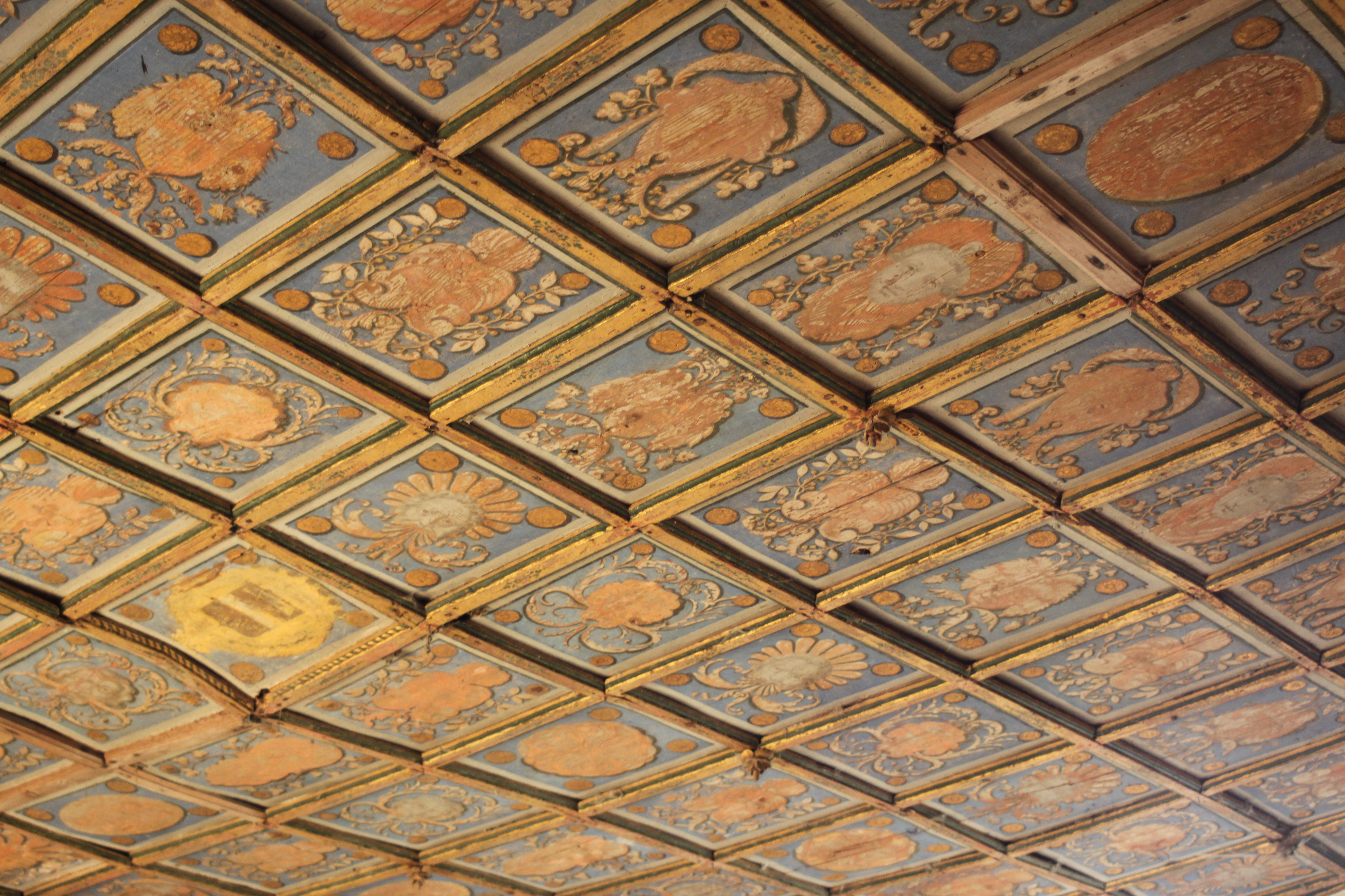 - Le joyau du château, réalisé au XVIIe s. par des artistes italiens, montrant de magnifiques plafonds à caissons qui s’affaissent progressivement malgré des consolidations non datées, mais peut-être du XIXe s.